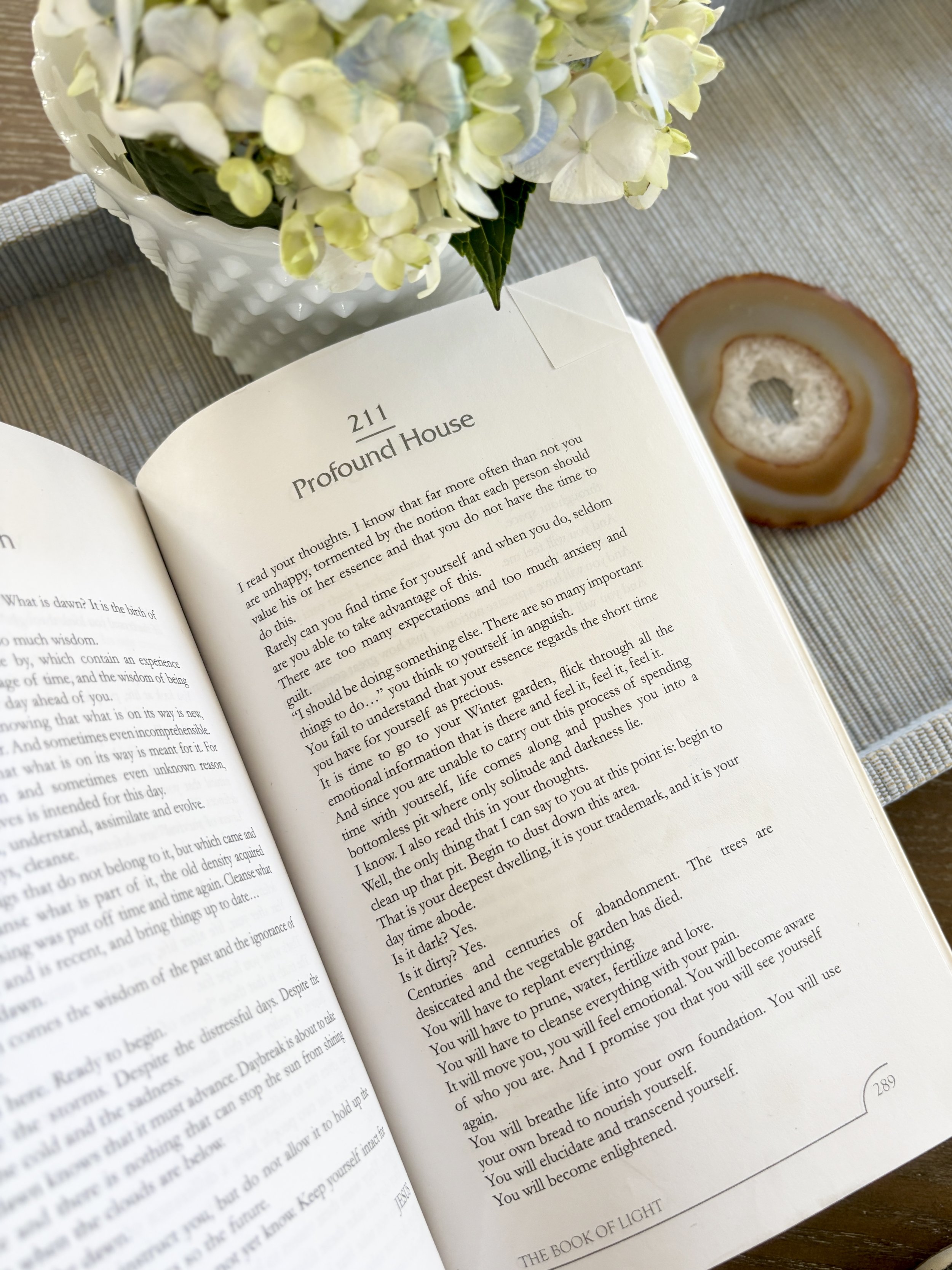 One afternoon, she felt strangely compelled to retrieve a discarded book from a sidewalk pile—The Book of Light by Alexandra Solnado. Using its oracle-style process, she landed on a passage titled “Profound House.” The message described an inner dwelling long abandoned—dark, overgrown, neglected—and urged the reader to tend to it. To go to their “winter garden.” To clear the centuries of abandonment. To replant. To restore. “And you will become enlightened.”